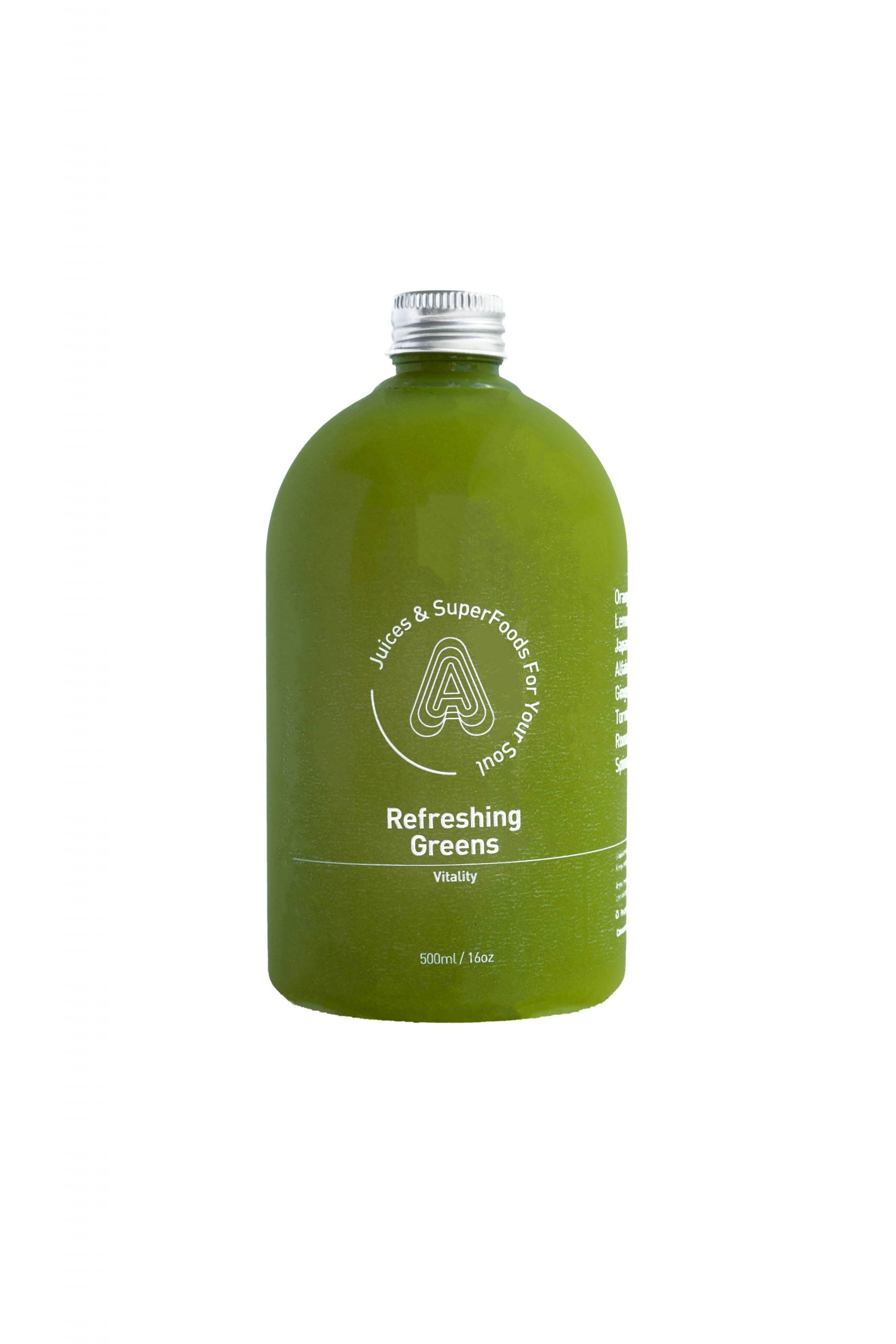 Ingredients: Orange, Lemon, Japanese Cucumber, Alfalfa Extract, Aloe Vera Water, Ginger, Turmeric, Romaine, Spinach
